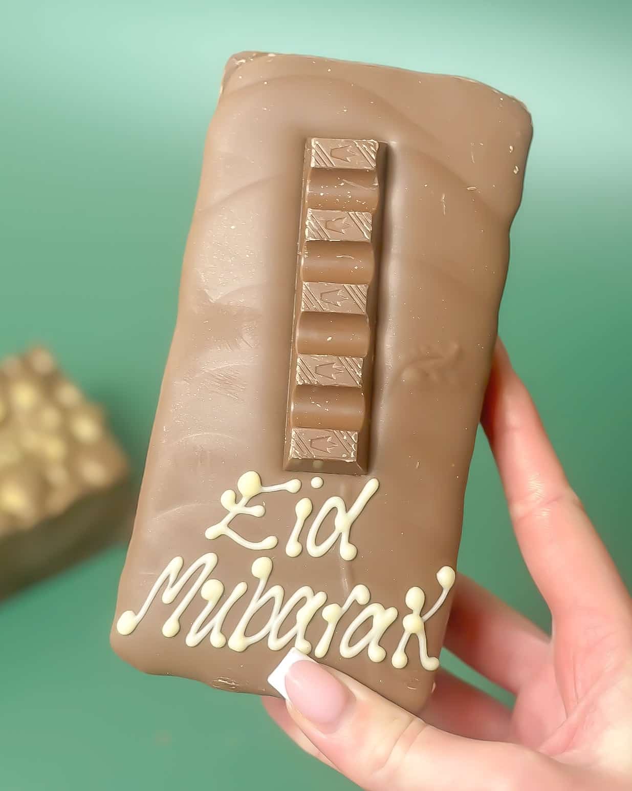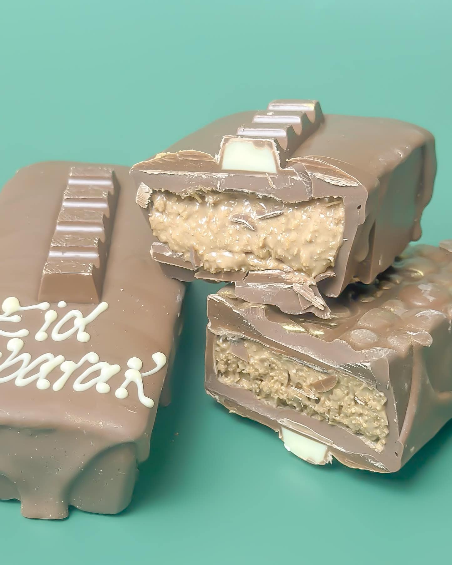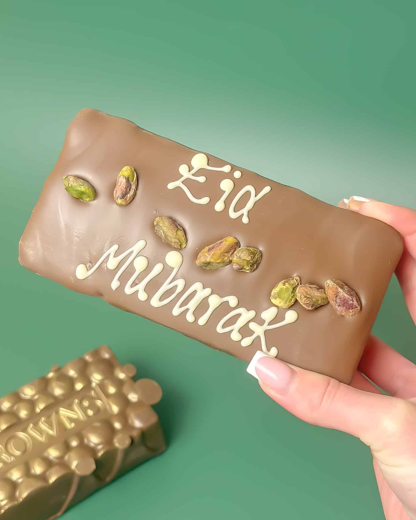 Each bar is made from a deliciously creamy Belgian milk chocolate outer shell, finished with “Eid Mubarak” written in white chocolate.