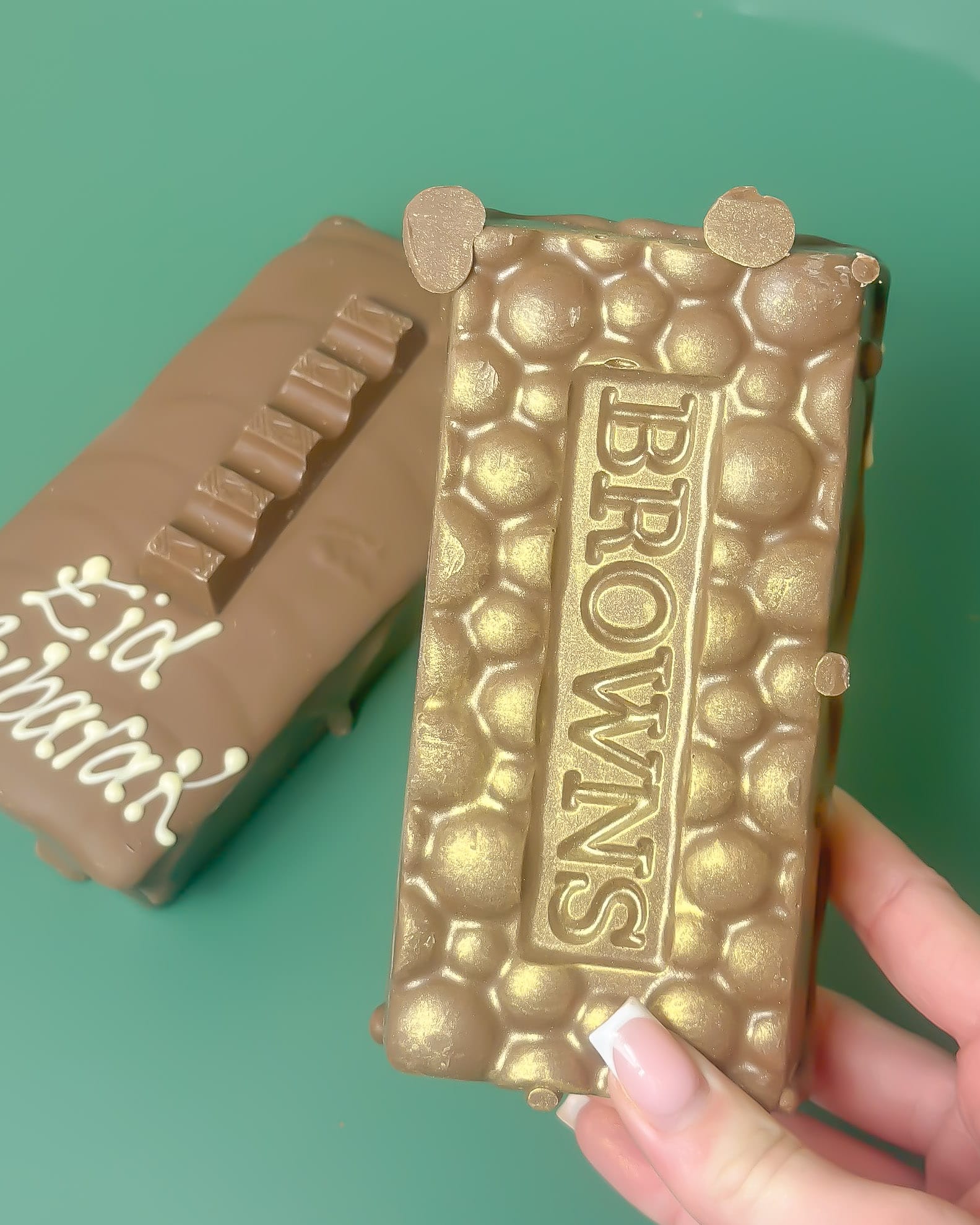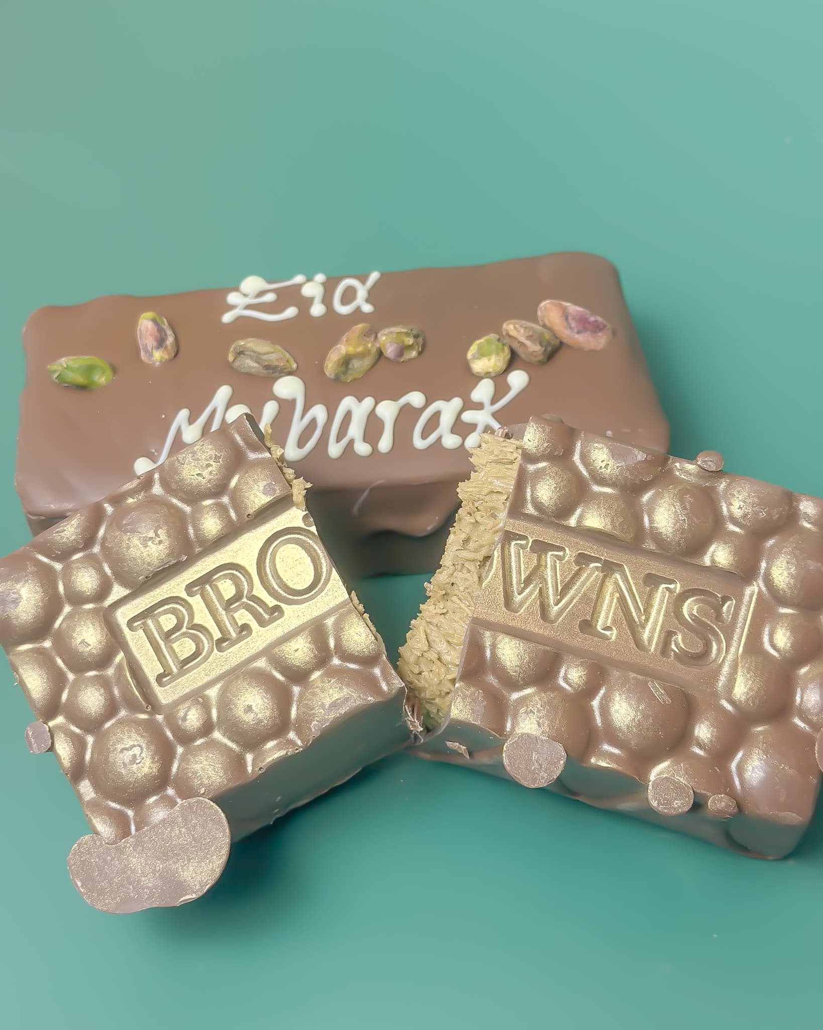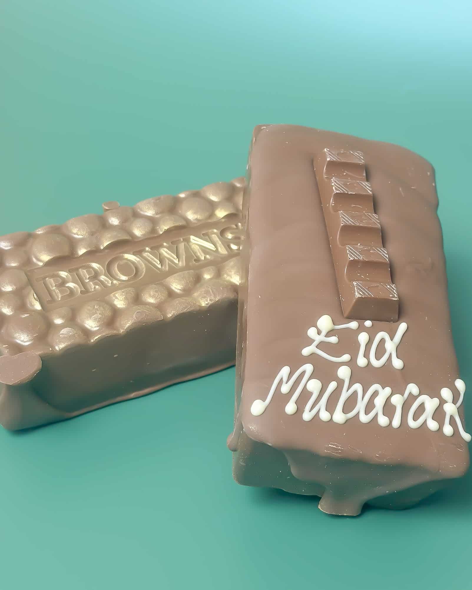 Each bar is made from a deliciously creamy Belgian milk chocolate outer shell, finished with “Eid Mubarak” written in white chocolate.