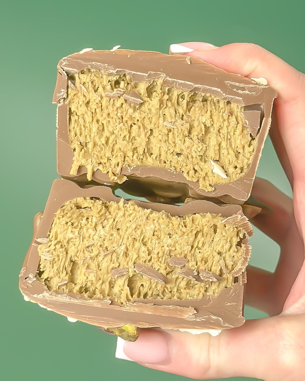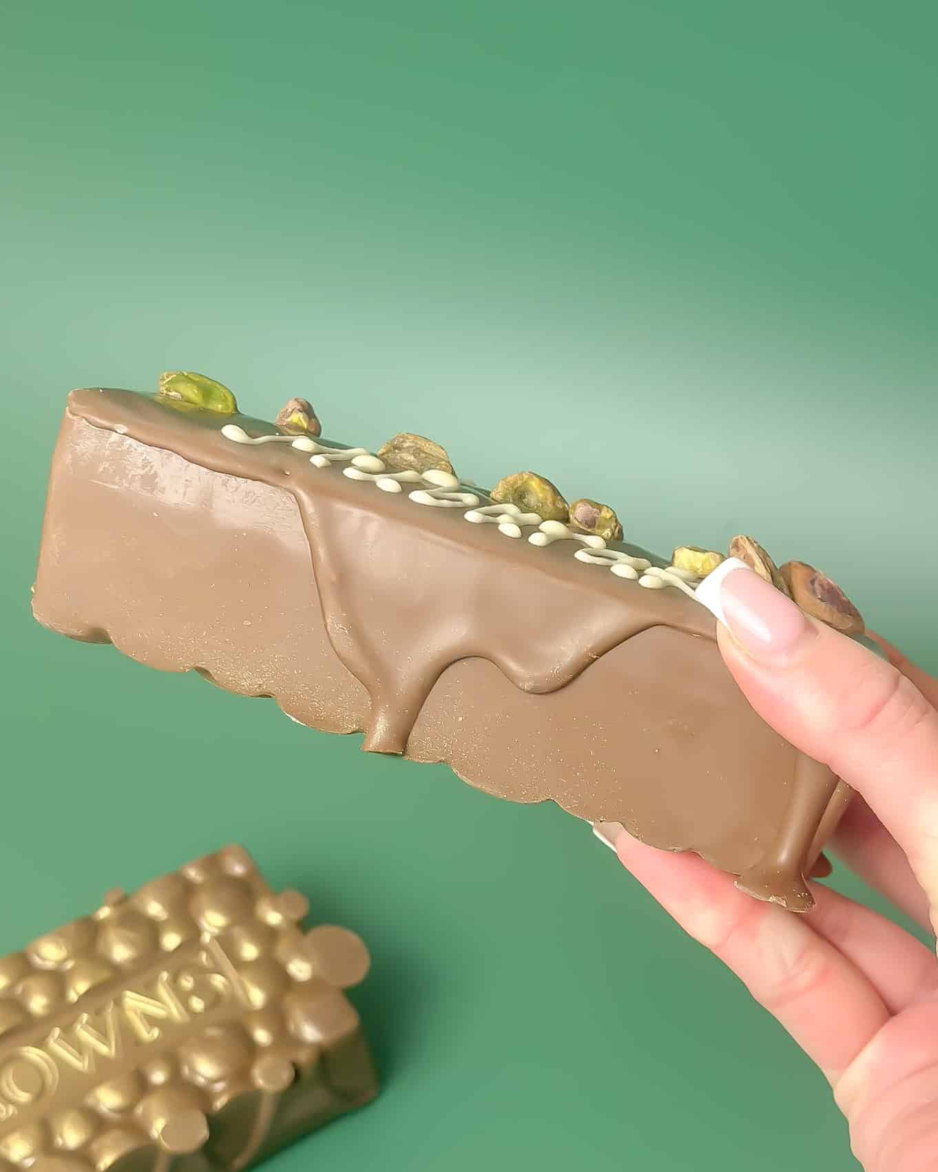 The bar is sealed with another layer of Belgian milk chocolate and topped off with salty pistachio nuts for the perfect balance of sweet and savoury.